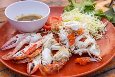 Steamed sea crab with spicy seafood sauce serving with shredded cabbage and tomato.
