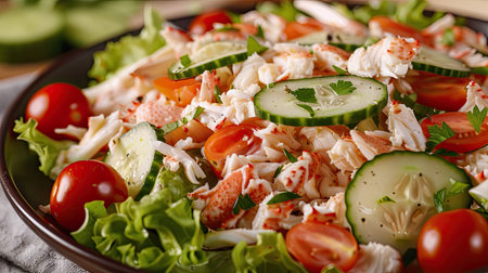 Delicious seafood salad featuring crab meat, cherry tomatoes, and cucumbers on a bed of lettuce
