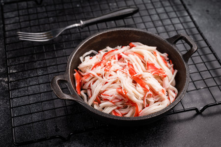 Japanese Crab meat, crabmeat imitation in a skillet. black background. top view.