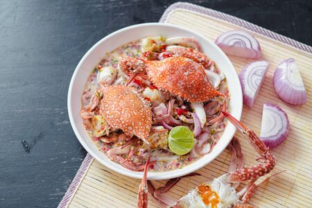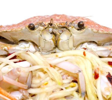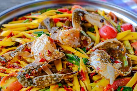Thai popular dishes, spicy papaya salad with raw blue crab