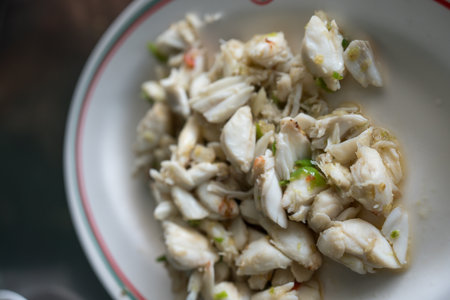 Steamed meat of Blue Swimming Crab with claws, vegetables and Thai style sauce in white dish on a wooden table.