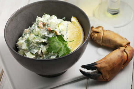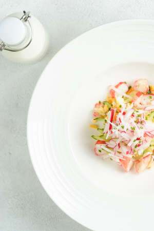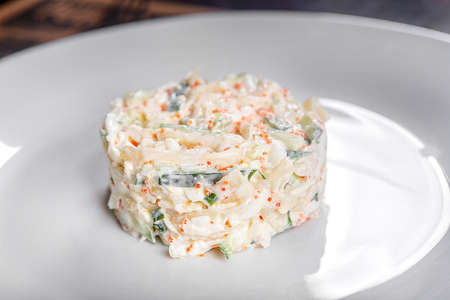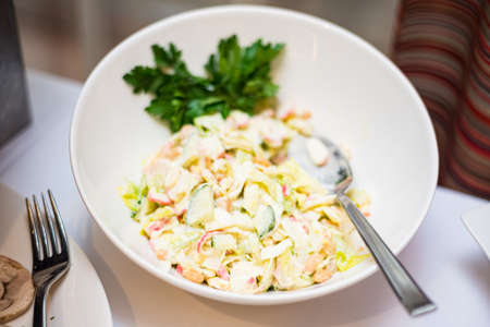 A plate of crab salad on the buffet table. Salad of fresh cucumbers, crab sticks, white beans, iceberg lettuce leaves, Lola rossa. dressed with mayonnaise.
