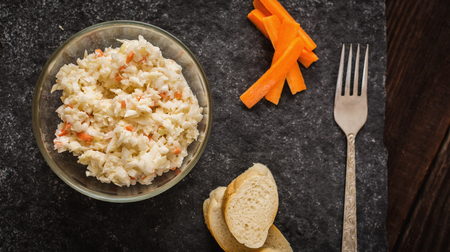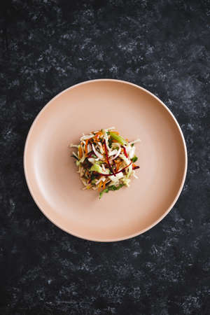 Fresh salad coleslaw of cabbage and carrots in glass bowl on stone plate top view
