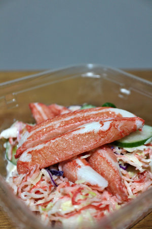 Crab stick (imitation crab meat) salad purchased at a supermarket in Tokyo, Japan