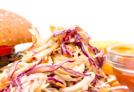 Healthy fresh coleslaw salad as a garnish for lamb burger. Macro. Photo can be used as a whole background.