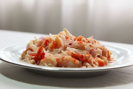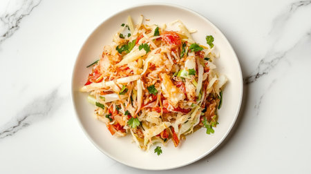 A vibrant spicy papaya salad topped with succulent crab meat. This fresh dish features colorful ingredients and a tangy flavor, perfect for a healthy meal.