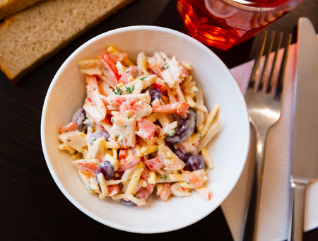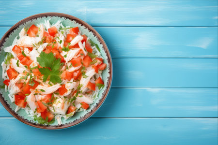Delectable Crab Stick Salad: A Visual Feast on Blue Wooden Background