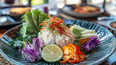 An artfully arranged plate featuring fresh noodles, vibrant vegetables, and aromatic herbs, perfect for showcasing gourmet culinary presentation in a restaurant decor.
