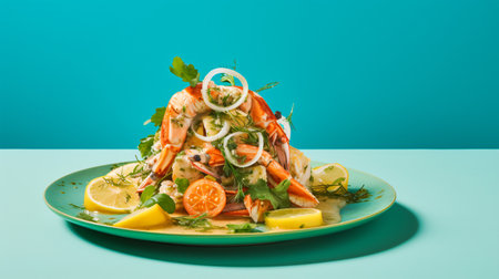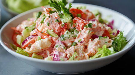 A vibrant bowl of fresh seafood salad featuring a mix of colorful vegetables. Perfect for healthy dining, catering events, or a delicious appetizer.