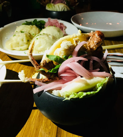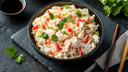 A fresh crab rice bowl garnished with vibrant herbs and spices, perfect for a delightful meal. Ideal for seafood lovers and gourmet cooking enthusiasts.