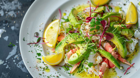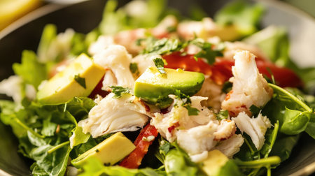 A vibrant seafood salad featuring mixed greens, fresh crab meat, avocado slices, and a light vinaigrette, showcasing the variety of seafood ingredients.