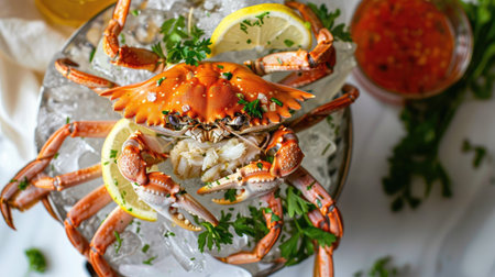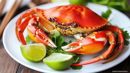 A vibrant plate featuring freshly cooked crab with lime wedges and herbs, capturing the essence of gourmet seafood cuisine. Perfect for culinary inspiration.