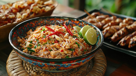 A vibrant bowl of Thai noodles garnished with fresh vegetables, lime slices, and colorful flowers, served on a rustic wooden table. Ideal for food lovers.