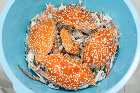Fresh seafood crab cooking food in the restaurant, Steamed or boiled Blue Swimming Crab ocean gourmet with herbs and spices
