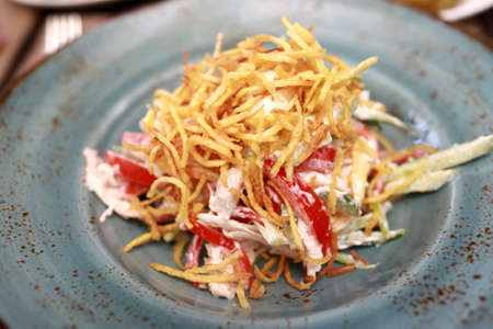 Vibrant salad featuring shredded chicken, fresh herbs, and orange roe. A perfect dish for healthy meals and nutritious dining experiences. Ideal for light lunches.