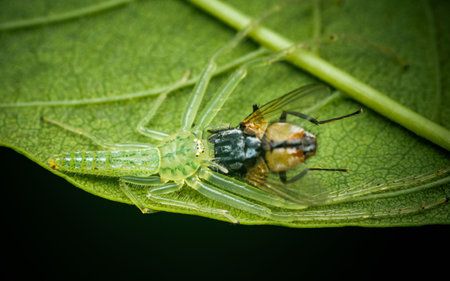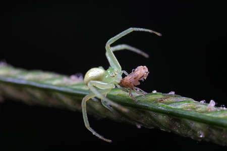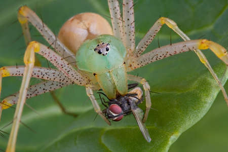 Green crab spider (Oxytate virens) eats fly prey on green leaf, Insect macro photography, Selective focus.