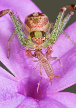 The macro closeup of a spider that eats a insect up on a flower