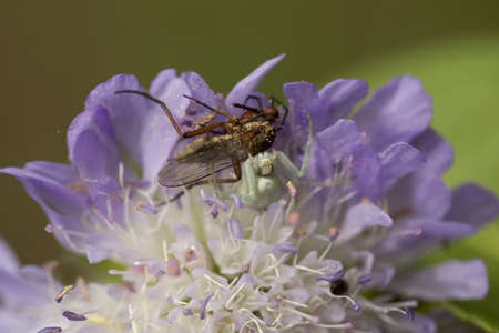 little green spider eat fly on flower