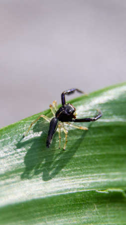 macro photography of a black scorpion mimic jumping spider standing on the edge of a green leaf
