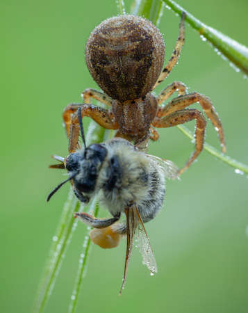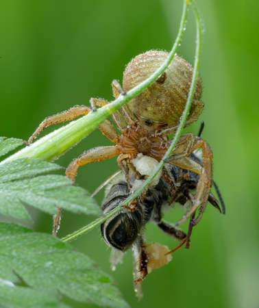 Xysticus spider hunter eating small caught died honeybee