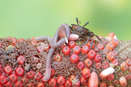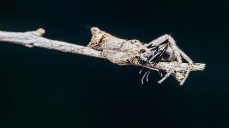 Close up of small spider eats ant in the garden.