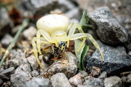 White goldenrod crab spider is holding and eating a bumblebee while standing on gravel.