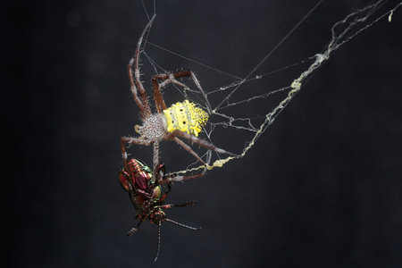 Spider caught a beetle and lets poison into it and keeps it on the grass