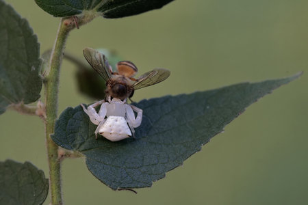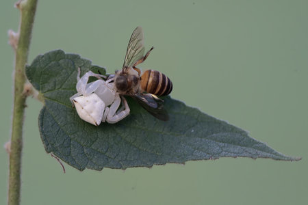 Honey bee and white crab on a green leaf of a plant