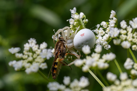 A Misumena vatia spider stealthily awaits its prey on a cluster of white flowers showing nature's intricate balance during a sunny spring day.