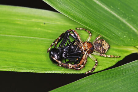 spider is catching black ant for food