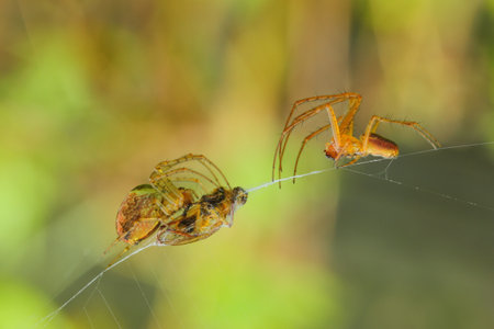 Two spiders caught a bee and weaving on a cobweb