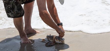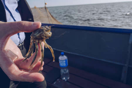 Sea crab in grille of sea catch by fisherman hand animal industry