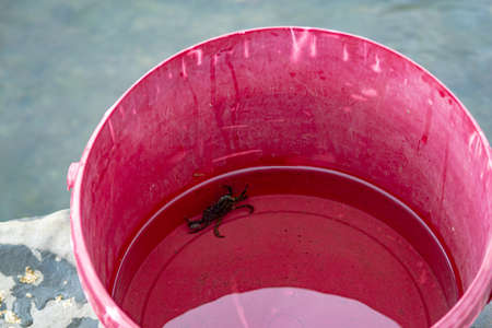 Small crab in a red bucket filled with water standing by the sea, a little crab caught and kept in a pot, animal abuse and enslavement for kids fun.