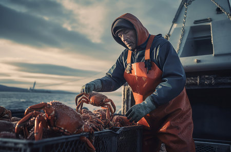 Man in hard hat and yellow raincoat offloading crabs