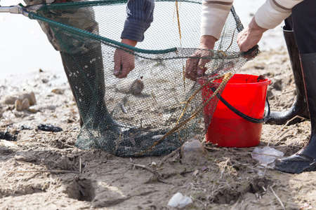 Fishermen catch blue crabs with fishing net