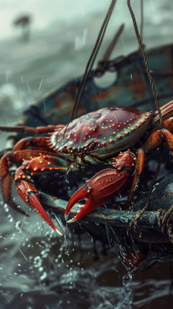 A vivid close-up of a red crab resting on a boat. In the background, a fishing vessel navigates through foggy waters, creating a unique marine atmosphere.