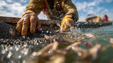 Hands of a fisherman handling a net at sunset on a fishing boat, with the golden light reflecting off the water
