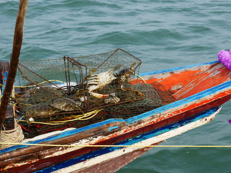 Fishermen are sorting their catch of fresh crabs in a boat on a river in Vietnam