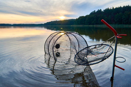Beautiful view of the sunset with net for fish over Lemiet lake in Masuria district, Poland. Fantastic travel destination.
