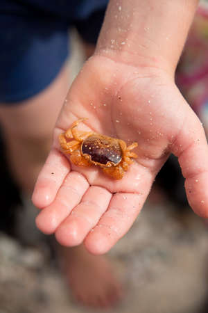 Adorable happy girl holding crab on the beach on spring day Focus on the crab