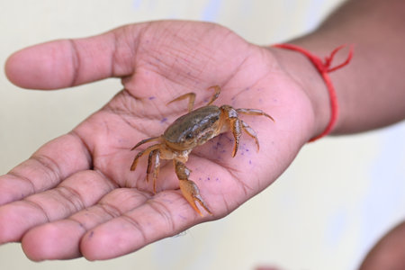 Barytelphusa cunicularis crab. It is a common species of freshwater crab found in India. It is found in large quantities in rice fields during the monsoon season in India.