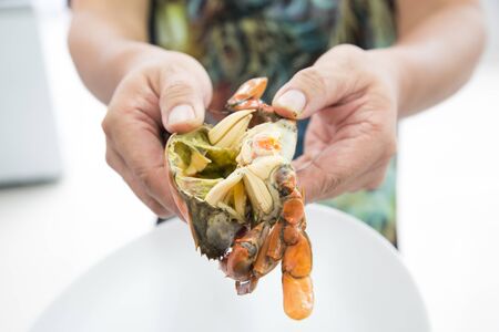 Top view picture of hands and red cooked crab on plate white table background. Exotic vacation food