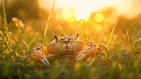 A captivating close-up of a crab amidst lush grass, basking in the golden light of sunset. The soft glow highlights its vibrant colors, creating a peaceful scene.