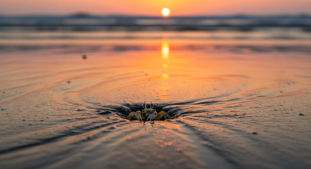 This image showcases a detailed view of a crab on a sandy beach, illuminated by the warm light of a sunset. The crab exhibits intricate patterns and textures, while the scene is composed with a shallow depth of field. This visual would be ideal for use in various projects that require natural imagery, such as websites and editorial content.
