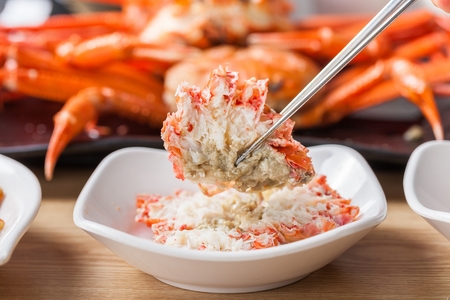 steamed red crab meat held by chopsticks
