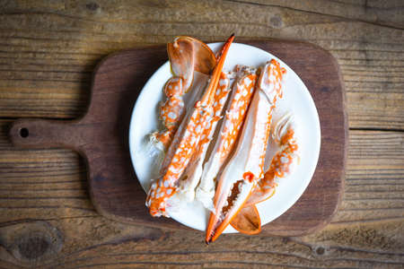 Boiled crab food on wooden board on the table, crab claws shellfish