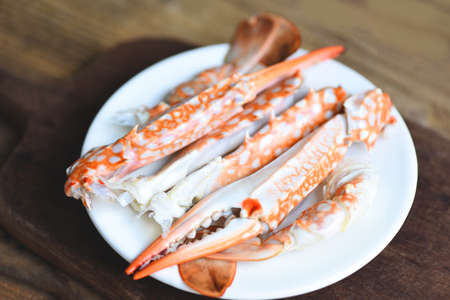 Boiled crab food on white plate on the table, crab claws shellfish seafood, blue swimmer crab