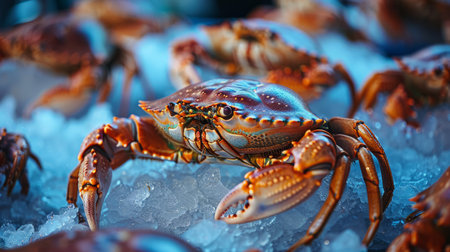 A striking arrangement of fresh red crabs resting on ice with a bright blue background, capturing the essence of seafood for culinary inspiration and vibrant presentations.