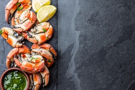 Crabs tentacles with wite wine, lemon, herbs sauce, slate background