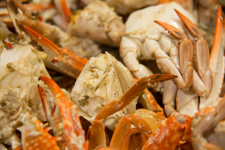 Close-up of a pile of cooked crabs on a seafood market